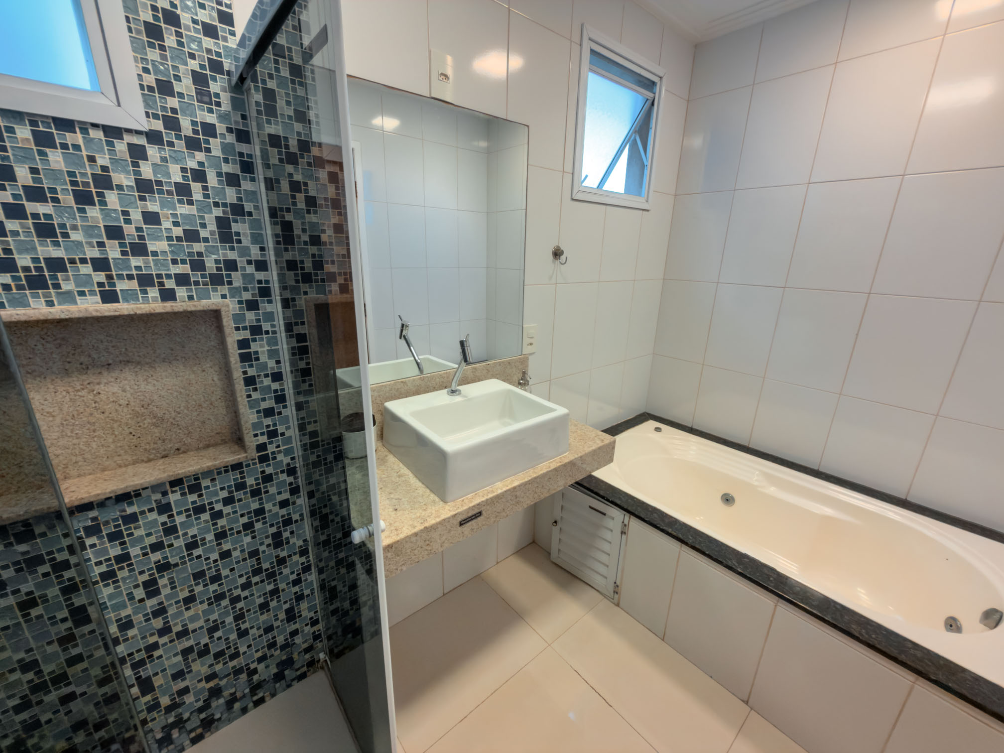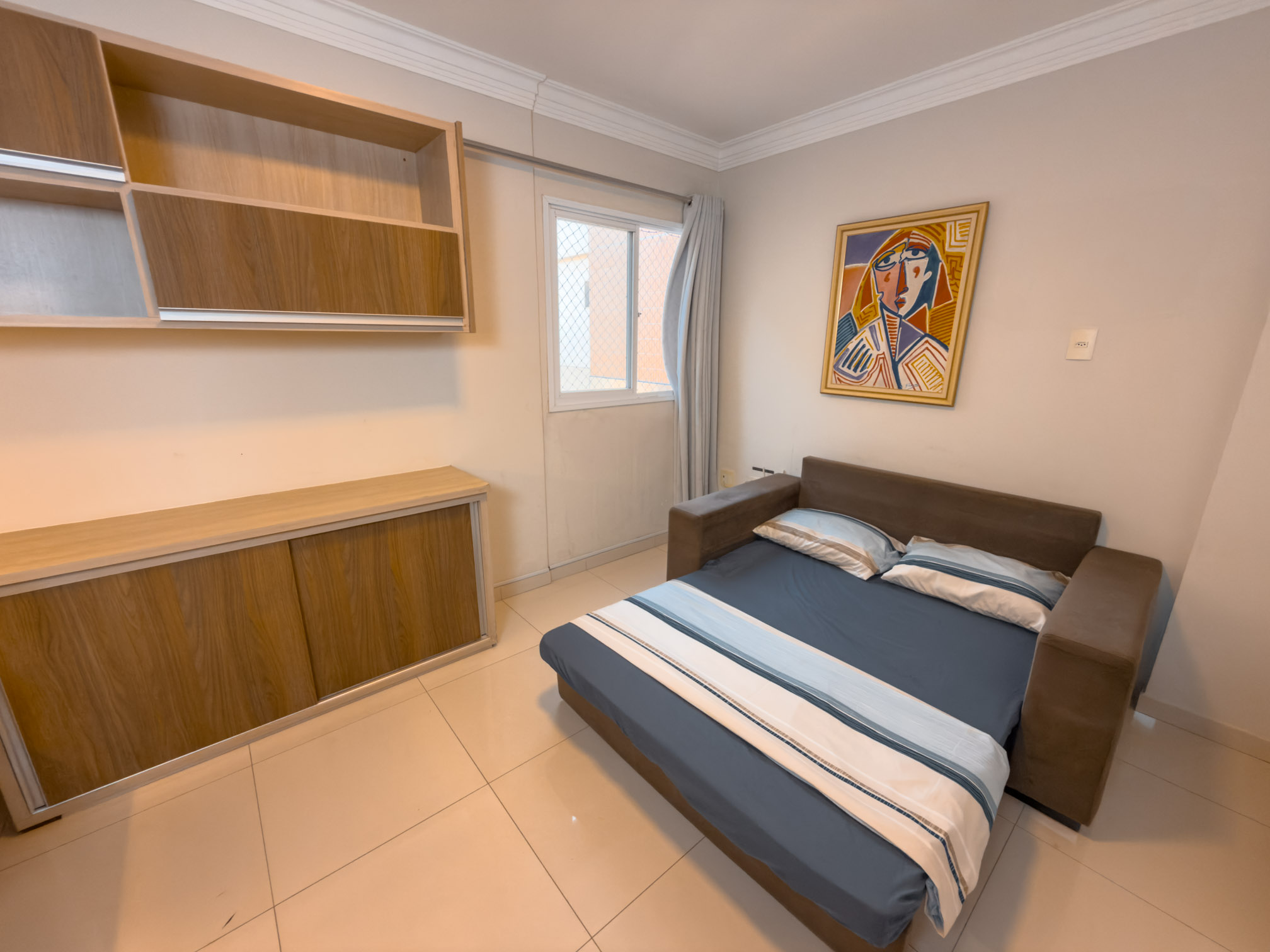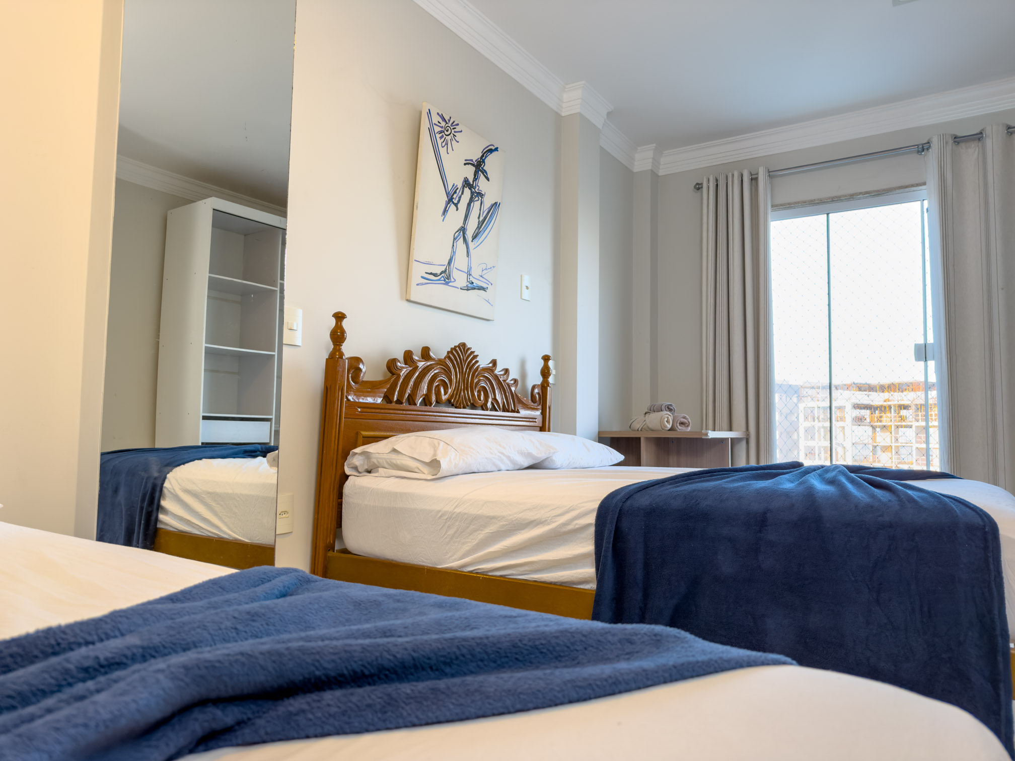 4 Quartos com janela pro mar azul, sendo 1 suíte master (banheiro duplo) com Ar-condicionado.